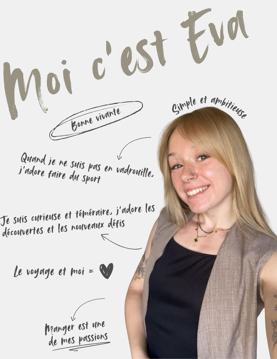 Je m’appelle Eva, jeune femme passionnée et dynamique. Je suis en constante évolution et à la recherche perpétuelle de liberté et de souvenirs. Je suis une femme inspirée, qui veut devenir inspirante et je veux me créer une vie qui me ressemble, sans me laisser enfermer dans un cadre rigide.