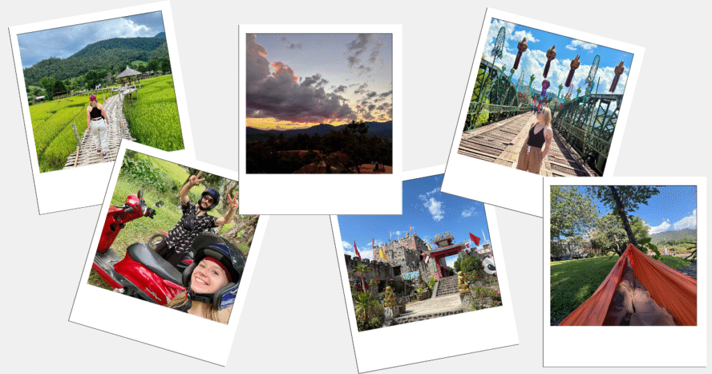 Paï a été une respiration. Après le bruit, les foules et les déceptions, arriver à Paï a fait l’effet de relâcher les épaules sans même s’en rendre compte. Cette étape n’était à la base pas prévue dans notre itinéraire mais par nos rencontres nous nous sommes retrouvés ici et nous avons adoré, nous avons presque regretté de n’y être restés que trois jours. La ville est petite, authentique, simple et c’est absolument ce qui nous fallait. Une rue principale, quelques bars, un night market à taille humaine et autour… de l’espace. Des montagnes, des routes, des points de vue, des sources chaudes, des cascades. Ici, les voyageurs se baladent pieds nus, il y a des hamacs à chaque coin de rue et des chiens qui dorment au milieu de la route. Les soirées sont simples : une bière, un joint et sont synonymes de rencontres. L’ambiance “baba cool” est bien présente ici et on sent que les gens viennent surtout pour ralentir, pour profiter de l’instant présent. Cependant, le côté authentique thaïlandais peut vite disparaître pour laisser place à une ambiance “backpackers” mais plutôt “friendly” : ici, on ne te pousse pas à la consommation, il n’y a pas de pression sociale et c’est un endroit encore un peu préservé des réseaux sociaux. On a également adoré le côté nature de cette ville, arpenter des routes au hasard sur notre scooter, suivre nos envies et prendre le temps de profiter de ce que le hasard mettait sur notre chemin : une rizière, une cascade, un coucher de soleil loin des foules. Ici, tu perds la notion du temps sans culpabiliser et ça fait du bien. C’est loin d’être une ville spirituelle ou culturelle mais après nos récentes déceptions de Chiang Mai et de Chiang Rai, découvrir cette ville ouverte et accueillante a été un véritable coup de cœur que je te recommande à 1000% !