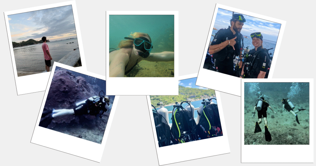 - Obtention du niveau 1 de plongée (open water) ainsi que les modules “épave” et “plongée à 30 mètres” pendant trois jours chez Go Diving, un centre de plongée espagnol (ils parlent anglais, français et espagnols). L’ambiance était vraiment top ! Nous avons assisté à des cours pratiques ainsi qu’à six plongées en mer. L’équipe est professionnelle, sympathique et bienveillante ; ils te mettent en confiance même si tu n’as jamais plongé. Le matériel est bien entretenu, de bonne qualité, les instructions sont claires et les moniteurs sont patients et attentifs à tes besoins. De plus, tu ne trouveras pas moins cher sur l’île — Koh Tao est d’ailleurs l’endroit le moins cher au monde pour plonger et passer tes niveaux).