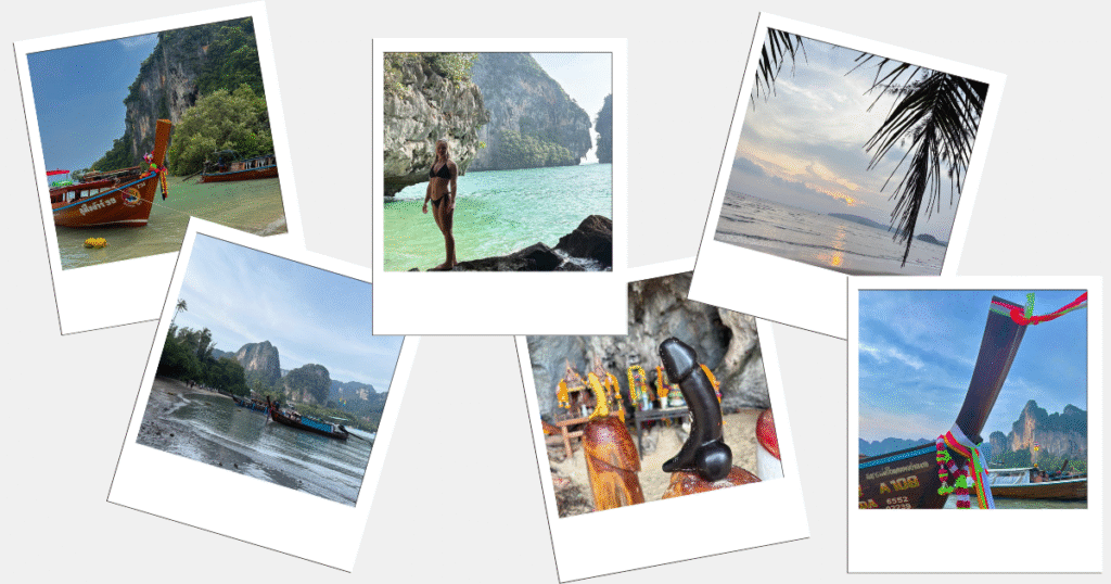 - Sur le chemin, nous avons vu des singes, traversé un chemin pédestre creusé dans la falaise et visité la Princess Cave : lieu culte pour les marins autour de la déesse protection Phra Nang et connu aujourd’hui pour ses offrandes en forme de phallus (qui symbolisent la fertilité, la chance, la prospérité, la naissance et descendance).